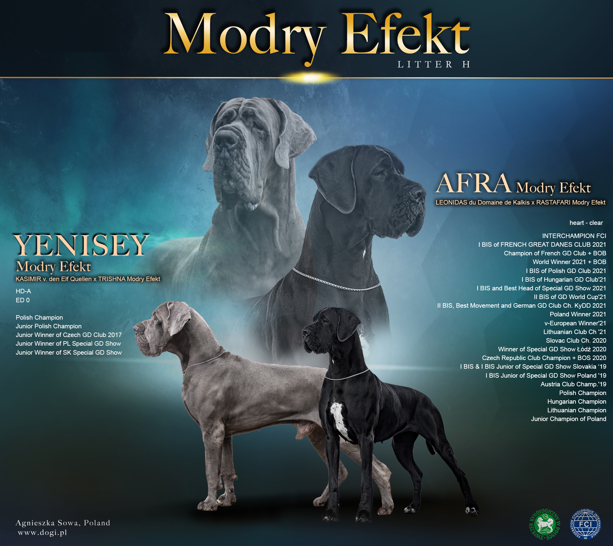 Modry Efekt I BEST in SHOW of Nationale d'Elevage Neuvic 2021 Champion of French GD Cub + BOB World Champion 2021 + Best of Breed(BOB) INTERCHAMPION FCI I Best in Show of Polish GD Club 2021 I Best in Show of Hungarian GD Club2021 I Best in Show and Best Head of Polish Special GD Show 2021 II Best in Show World Cup'21 II Best in Show, Best Movement and Champion of German GD Club KyDD 2021 Poland Winner 2021 v-European Champion 2021 Champion of Lithuania GD Club '21 Champion of Slovac GD Club'20 Winner of Special GD Show Łódź 2020 Champion of Czech GD Club +BOS 2020 I Best in Show and I BiS Junior of Special Slovac GD Show 2019 Champion of Austria GD Club '19 Pl. Champion Hu. Champion Lt. Champion Heart OK 3 x echo i 3 x holter |